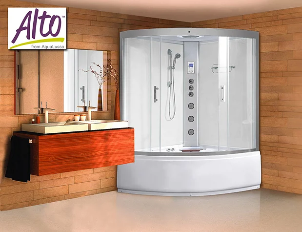 The Alto ST Steam Shower and Whirlpool Bath, a elegant, large corner family sized bath with Whirlpool and steam shower combined finished in a Polar White colour. A full sized family bath with integrated whirlpool system, sits beneath a vary spacious steam shower cabin with integrated audio system.