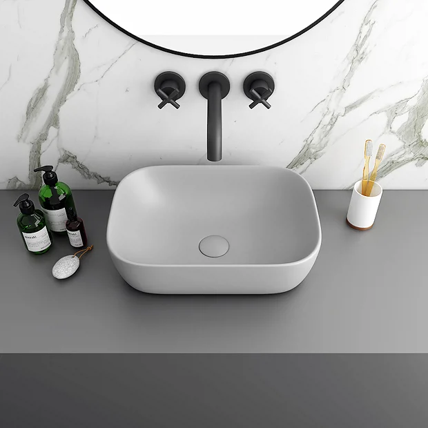 The eye catching luxury Arezzo matt grey coloured counter top basin has a stylish contemporary curved shape, perfect for creating a boutique feel in your bathroom. Designed to be mounted onto a worktop console and is best complemented with a high rise basin mixer or wall mounted tap. Manufactured from high quality vitreous china with a matt grey finish. Some small dimensional variation may occur due to manufacturing tolerances. Waste not included.
