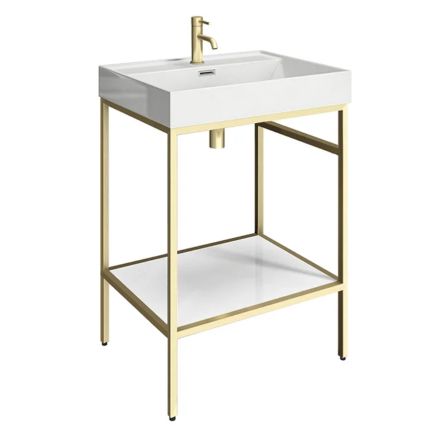 (1) Brushed Brass 600 Washstand with Gloss White Open Shelf