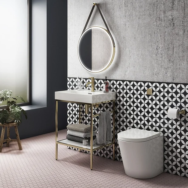 An extension of the Arezzo bathroom furniture range, this stunning bathroom suite features a 600mm wide polymarble basin with brushed brass wash stand, stylish back to wall toilet and a concealed cistern with luxury brushed brass flush button.