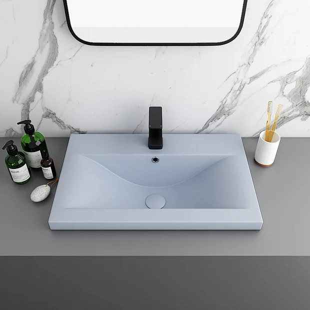 The eye catching luxury Arezzo matt blue coloured inset basin with one tap hole has a stylish contemporary rectangular shape, perfect for creating a boutique feel in your bathroom. Designed to be mounted onto a worktop console or vanity unit. Manufactured from high quality vitreous china with a matt pastel blue finish. Some small dimensional variation may occur due to manufacturing tolerances. Waste not included.