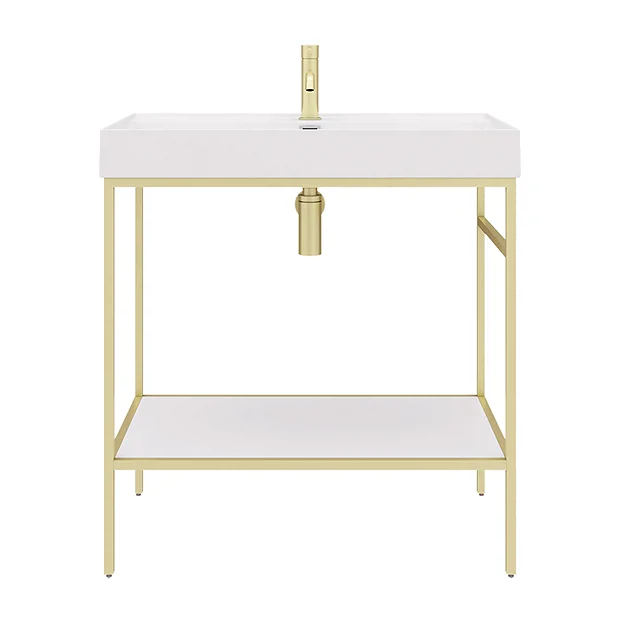 Arezzo 800 Brushed Brass Framed Washstand with Gloss White Open Shelf and Basin