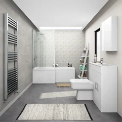 Ideal for kitting out a cloakroom or compact bathroom, this Arezzo Combination Suite offers functionality, contemporary styling and ample storage too. The cistern unit and pan project 660mm from the wall and the dual flush toilet keeps water consumption to a minimum. As well as the square toilet, this piece includes a glossy white basin and worktop with the same regular lines, while the cabinetry is finished in a smart grey. Two concealed soft close drawers in the vanity provide plenty of room for your toiletries. Easy to keep clean, cloakroom bathroom suite conceals all pipework neatly away.