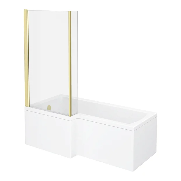 Arezzo L-Shaped Shower Bath 1700mm (inc. Hinged Brushed Brass Screen with Fixed Return + Acrylic Panel)