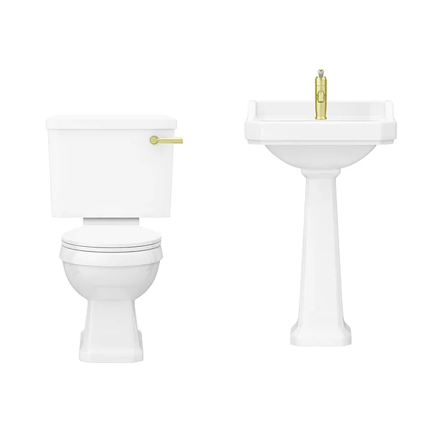 Add a vintage-inspired look to your home with the Arezzo Traditional Bathroom Suite. Its distinct period style is best demonstrated by the striking roll top bath, complete with classic white ball and claw legs that can be adjusted for uneven floors. This traditional bathroom suite also features a high quality close coupled toilet with a stunning brushed brass cistern lever. This WC ensemble is a superb complement to the sink with pedestal, which offers plenty of ledge space for your soap and toothbrush holder.