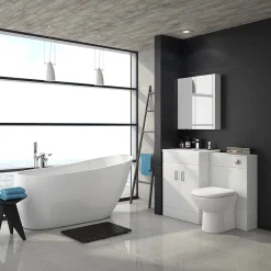 Valencia Bathroom Suite (Toilet, White Vanity With Chrome Handle, L-Shaped Bath + Screen)