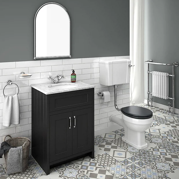 A high-quality traditional bathroom suite featuring a traditional low level toilet and a 610mm wide vanity unit with marble basin top; it’s classic styling has been designed to match the Chatsworth range of bathroom furniture. Victorian inspired design with a modern twist.