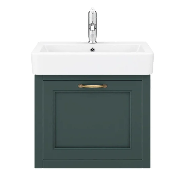 A high-quality traditional bathroom suite featuring a traditional low level toilet and a 560mm wide wall hung green vanity unit with it’s classic styling has been designed to match the Chatsworth range of bathroom furniture. Victorian inspired design with a modern twist.