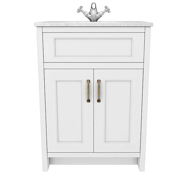 A high-quality traditional bathroom suite featuring a traditional low level toilet and a 610mm wide vanity unit with marble basin top; it’s classic styling has been designed to match the Chatsworth range of bathroom furniture. Victorian inspired design with a modern twist.