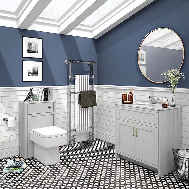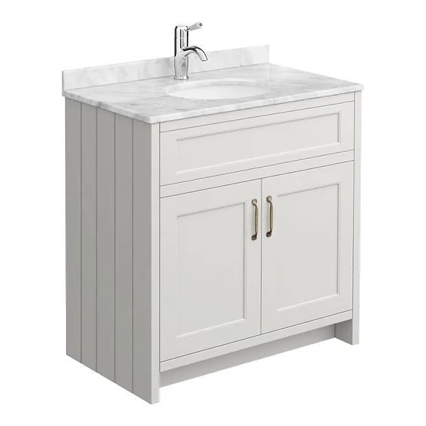 The Chatsworth traditional 810mm wide white marble grey vanity unit with wc unit toilet package, Victorian inspired design with a modern twist. The Chatsworth range of charming bathroom furniture features classic styling with a satin grey finish cabinet and tongue-and-groove side panelling.