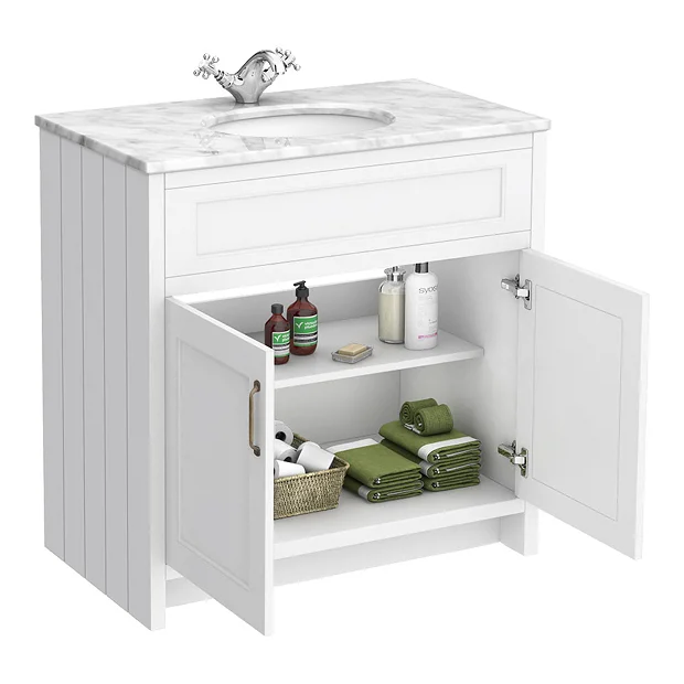 The Chatsworth traditional 810mm wide white marble vanity unit with wc unit toilet package, Victorian inspired design with a modern twist. The Chatsworth range of charming bathroom furniture features classic styling with a satin white finish cabinet and tongue-and-groove side panelling.