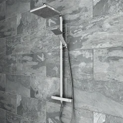 - Thermostatic shower, consisting of a square thermostatic bar valve and rigid riser kit with twin square shower heads
