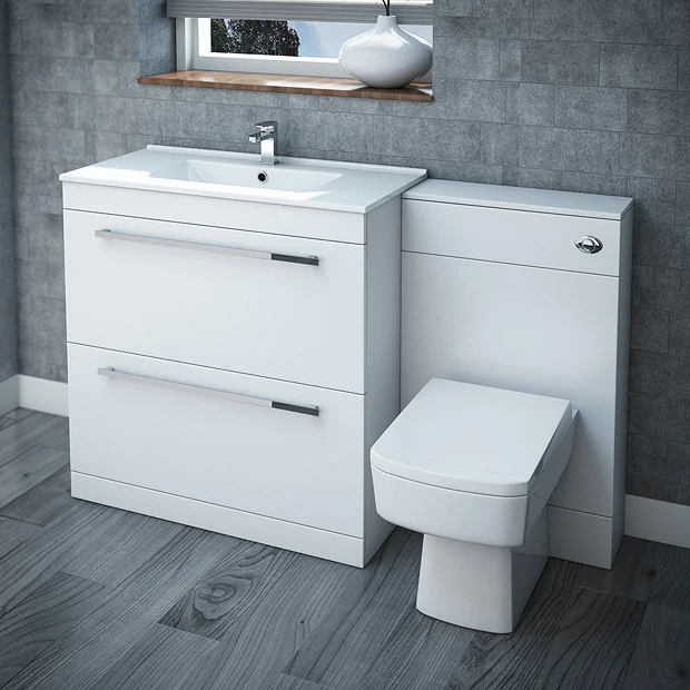 Cutting edge style meets practicality with the Nova Vanity Bathroom Suite. This modern bathroom suite has a squared profile with a gloss white finish to complement a contemporary space. The toilet projects 520mm from the back to wall unit, which conceals a clever dual flush cistern – ideal for lowering your water consumption and saving money when you use the half flush mechanism regularly. This vanity unit bathroom suite also has soft closing drawers and a handy drop down door, which maintain bathroom tranquillity by reducing slamming and providing a pragmatic storage solution to keep surfaces free from clutter.