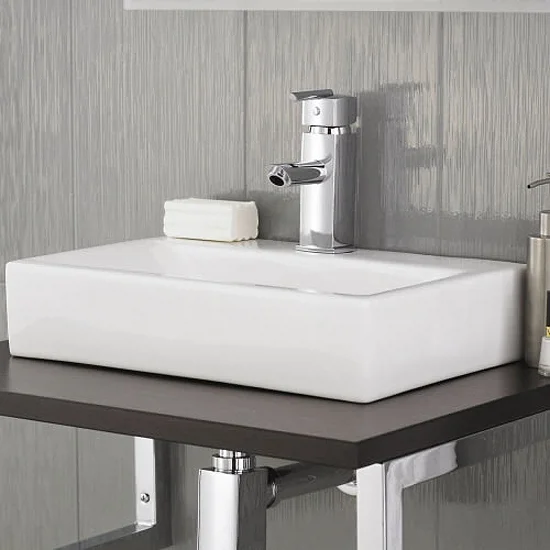 Looking for a countertop sink? The Rectangular Ceramic Basin is designed so it’s easy to install – just pop it directly onto your chosen shelf and connect it up to your waste. A compact 460mm wide, the countertop basin suitable for smaller bathrooms, and the geometric design has gently rounded edges for a modern look. The high quality ceramic gloss white basin is durable and simple to keep sparkling clean. For a shelf that would work well with this basin, consider the Nova Wall Hung Slimline Basin Shelf.