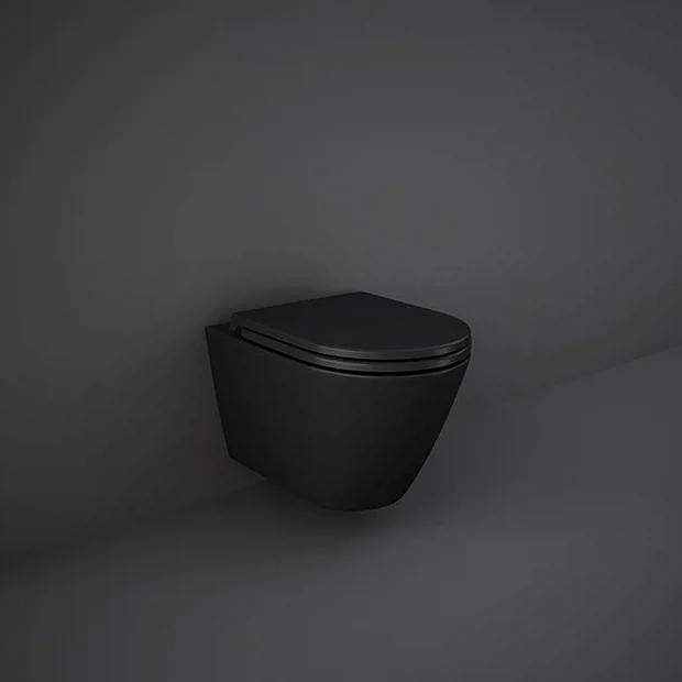 With a projection of only 520mm, the RAK Feeling matt black rimless wall hung toilet is perfect for small sized bathrooms. RAK Rimless delivers the ultimate level of hygiene control in your bathroom, there is no hidden rim where germs, bacteria and lime scale can build up. The entire surface of the toilet can be easily cleaned producing a more hygienic result. Made from high quality vitreous china and finished in eye catching matt black. Comes with matching matt black toilet seat featuring a practical soft-close hinge which stops the lid from slamming
