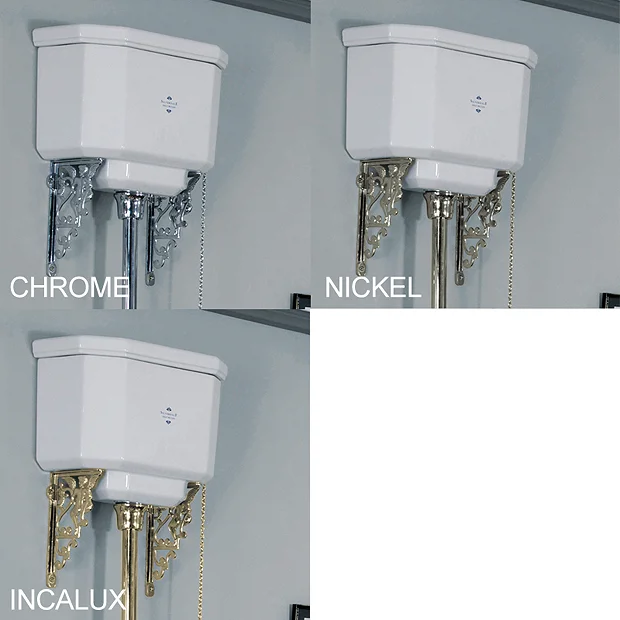 Available with either chrome, incalux (Gold) or polished nickel luxury high level fittings kit. Fittings kit includes – flush pipe, brackets, ceramic disc & ceramic pull handle with decorative lettering.