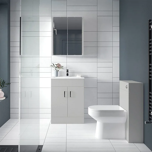 Give your bathroom a Scandi aesthetic with the Toreno Sink Vanity Unit Package. Both the 620mm wide vanity and the accompanying toilet unit are finished in trendy grey gloss for a coordinating look. This modern bathroom suite also comes complete with a neatly concealed dual flush toilet and back to wall pan. You can fix the flexible flush on the left or right to suit your space and the spacious cupboards with soft closing doors help keep your bathroom tidy. To top off the ceramic basin, why not try a Toreno Modern Chrome Mono Mixer?