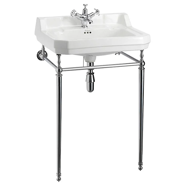 This Basin is available in a choice of 1, 2 or 3 Tap holes (1TH pictured), this option opens you up to be able to choose from the entire range of Burlington Taps. This Basin comes complete with a stunning Chrome Wash Stand.