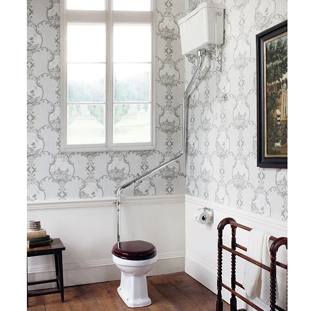 Burlington’s high level cistern ‘chain’ is a rigid chrome pipe to allow you to push up for the 3 litre water saver or pull down for a 6 litre flush. Now you can have a high level cistern whilst saving water too!