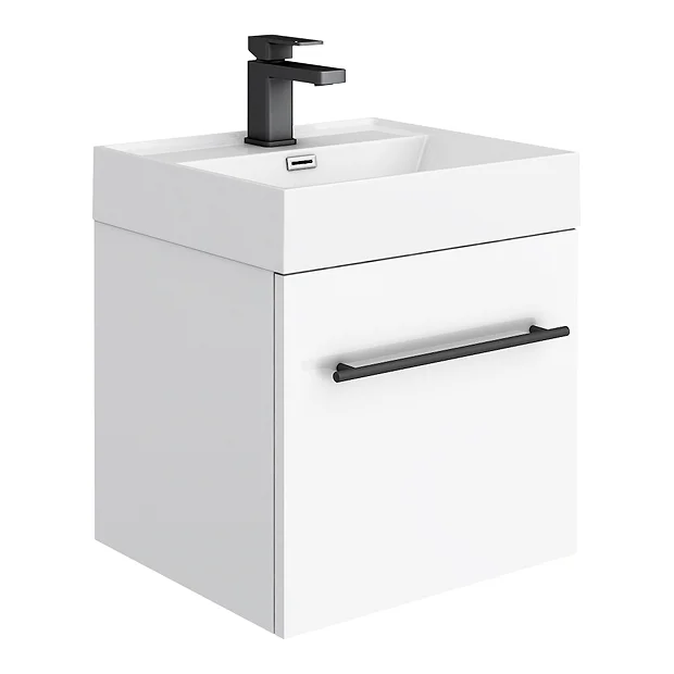Supplied with a durable gloss white cabinet with matching thin edged polymarble basin and minimalist matt black T-bar handle.