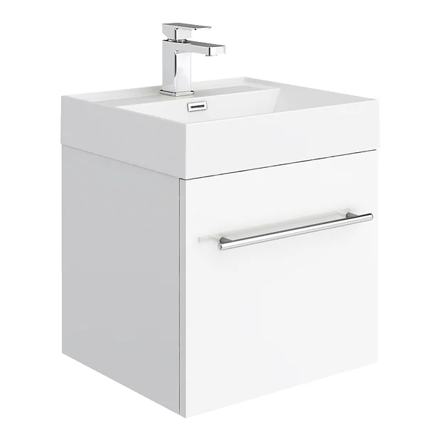 Add innovative sleek design to your bathroom with the minimalist Valencia 450 gloss white vanity and classic close coupled toilet, this space saving suite is perfect for cloakrooms.
