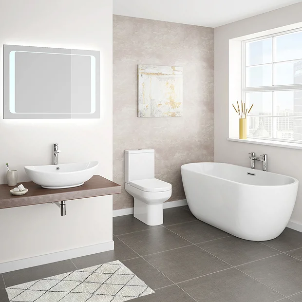 The stylish modern Antonio double ended curved free standing bath suite would look stunning in any bathroom. Includes a 590mm wide oval shaped counter top basin, a contemporary close coupled toilet with a soft close seat and dual flush cistern for improved water consumption and a luxury modern quality white gloss smooth acrylic double ended curved free-standing bath. Some small dimensional variation may occur due to manufacturing tolerances.