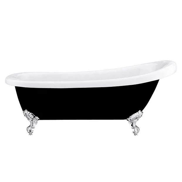 Made with double skinned acrylic with a superb white and black surface finish. Slipper bath has no tap holes and a continuous rolled rim.