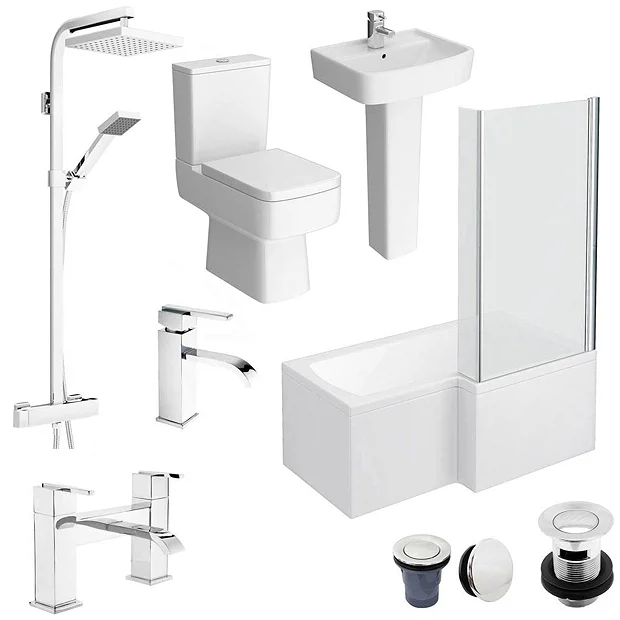 The Bliss L-Shaped 1500 complete bathroom package includes everything you need for creating a stylish contemporary bathroom in your home. Optional bath end panel (WBS301) sold separately.
