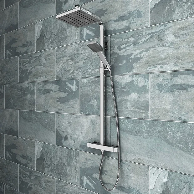 - Thermostatic shower, consisting of a square thermostatic bar valve and rigid riser kit with twin square shower heads
