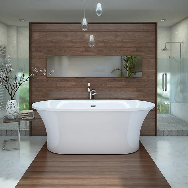 This elegant modern double ended roll top free-standing bath is part of our our bath collection containing some of the most desirable bath designs available today. Features a stylish thin edge with a integrated chrome finish overflow and click clack waste. If you want to make a statement with your bath design, then choose from our luxury collection. Made with quality white gloss smooth acrylic. This bath has been designed for use with wall mounted or floor mounted free standing taps.