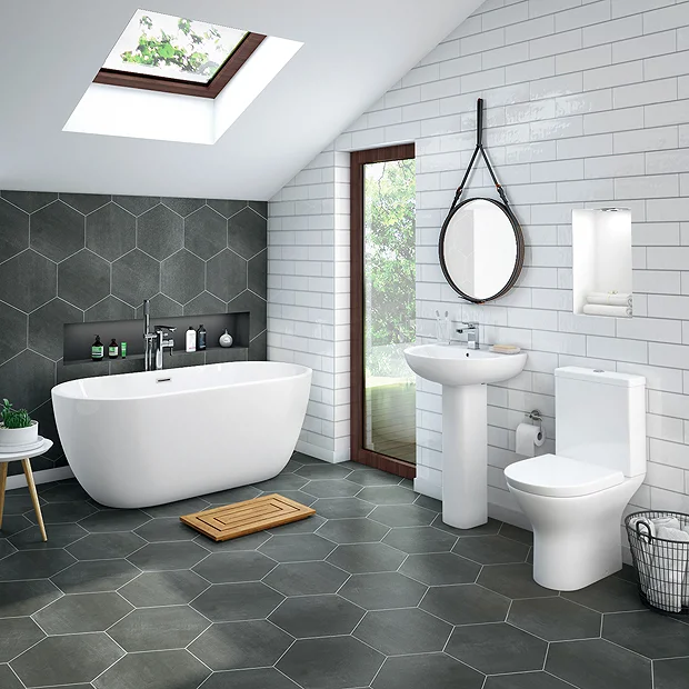 A modern freestanding bath suite package featuring a luxury double ended bathtub with a clean contemporary lines and a stylish space saving round toilet and basin.
