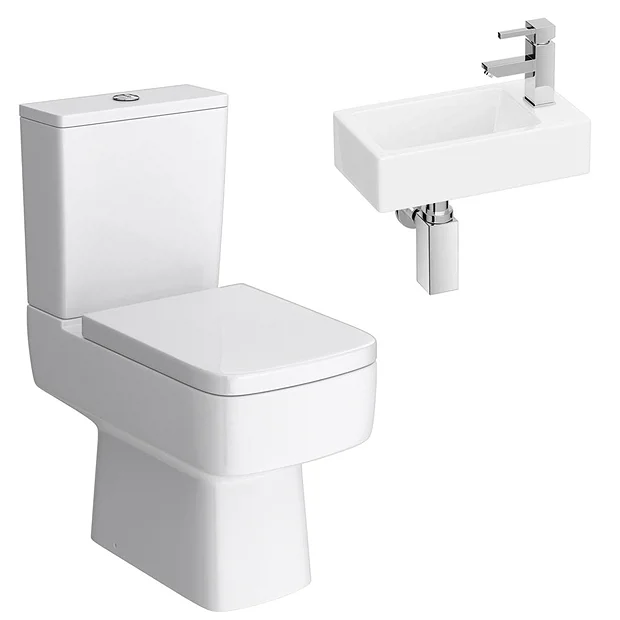 The stylish Rondo modern square shaped cloakroom suite, featuring a close coupled dual flush toilet with a compact wall hung cloakroom basin. This modern cloakroom suite is perfect for a cloakroom, en-suite or small bathroom where space is limited. Some small dimensional variation may occur due to manufacturing tolerances.